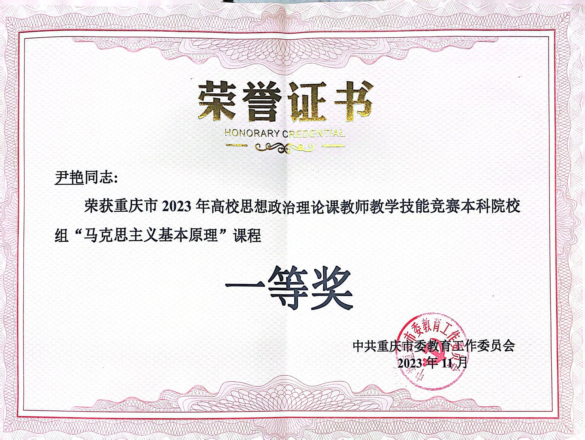 图为尹艳老师荣获“马克思主义基本原理”课程一等奖