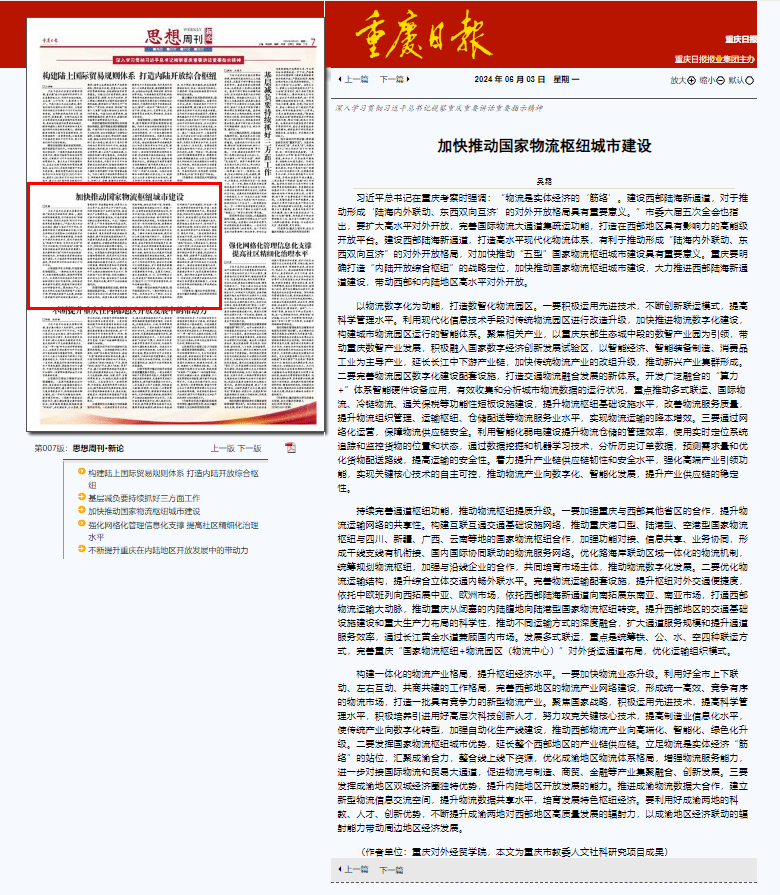 祝贺!6月3日《重庆日报》刊发吴霜老师署名文章:“加快推动国家物流枢纽城市建设”