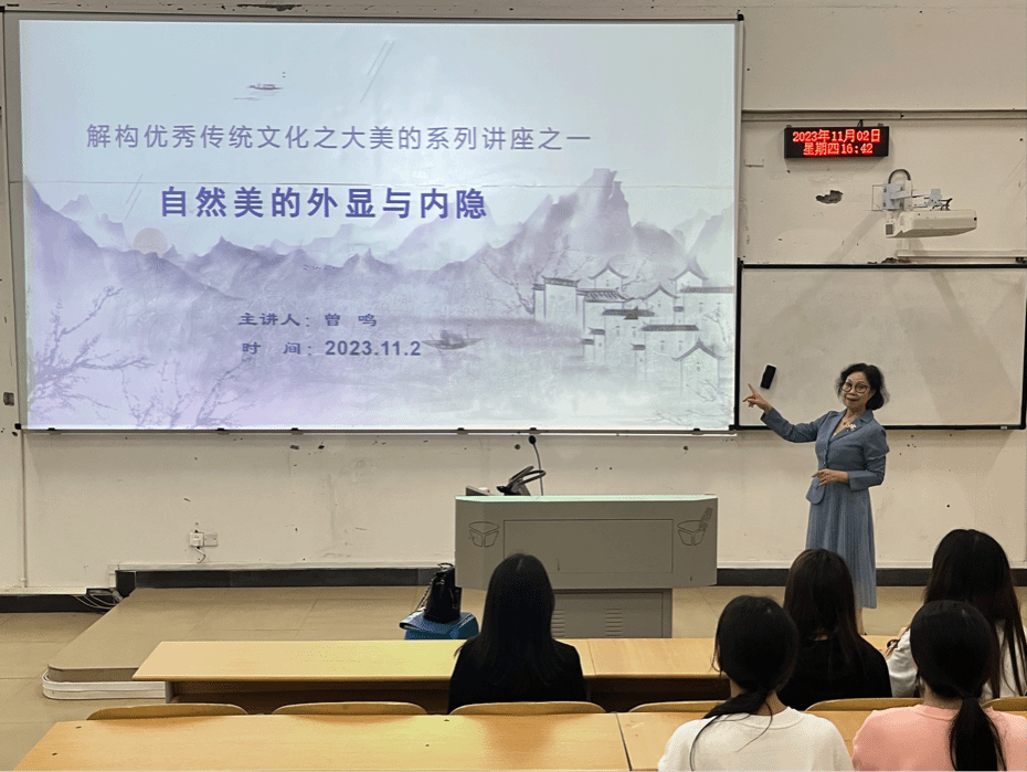 讲座中,曾鸣副教授从分析探讨中华优秀传统文化的自然美角度,通过关于“文化”定义及民族文化传承意义、关于“美”的概念及“美育”功能以及中华优秀传统文化中的自然美探析三部分内容讲解和丰富的视频、图片等资料的展示,引导学生从理性层面认识和理解优秀传统文化自然美的外显和内隐,从而吸取中华优秀传统文化精髓,增强文化自觉。曾教授特别谈到,中华优秀传统文化之自然美所追求的最高层面在于对人的尊崇,是倡导“天人合一”的顺其自然之美,是“合和之美,美美与共”,要坚持崇尚自然,绿色发展,为共建人与自然和谐的美丽中国而努力。
