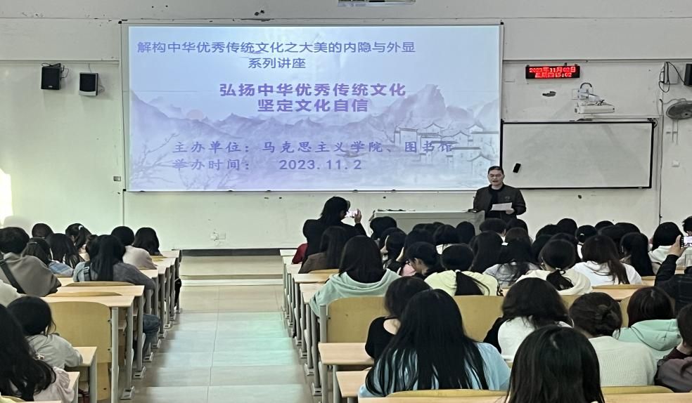 为贯彻落实习近平总书记关于“文化传承”系列重要讲话精神,版权所有:中国·ok138cn太阳集团(股份)有限公司-官方网站制定了《关于推进中华优秀传统文化进课堂的教学活动实施意见》。11月2日下午,太阳集团tyc9728和图书馆于A校区6116阶梯教室联合组织了以《弘扬中华优秀传统文化,坚定文化自信》的主题讲座。