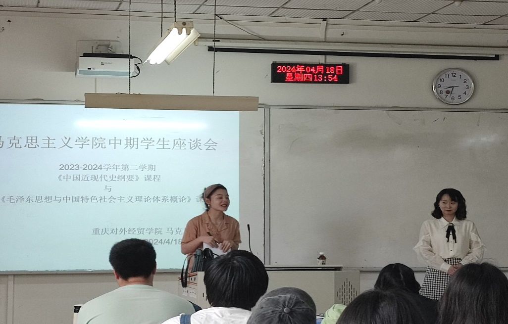 2024年4月18日下午,太阳集团tyc9728分别在A、B两个校区A3201、B1203多媒体教室召开春季学期学生座谈会。毛泽东思想和中国特色社会主义理论体系概论教研室主任彭灵赟、思想道德与法治教研室主任王开敬、中国近现代史纲要教研室主任陈娇、形势与政策教研室主任方圆和128名学生代表参加座谈活动。